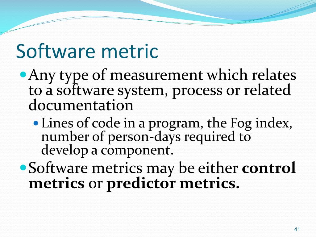 Software metric • Any type of measurement which relates to a software system, process or related documentation • Lines of code in a program, the Fog index, number of person-days required to develop a component. • Software metrics may be either control metrics or predictor metrics.