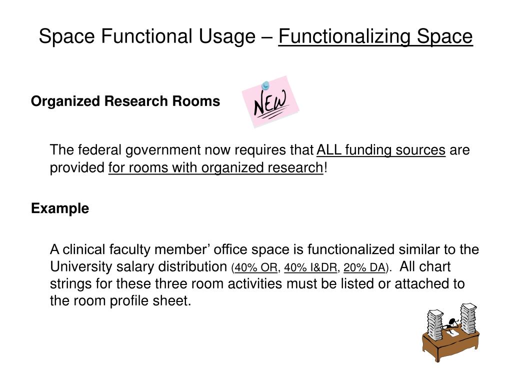 Space Functional Usage – Functionalizing Space Organized Research Rooms The federal government now requires that ALL funding sources are provided for rooms with organized research! Example A clinical faculty member’ office space is functionalized similar to the University salary distribution (40% OR, 40% I&DR, 20% DA). All chart strings for these three room activities must be listed or attached to the room profile sheet.