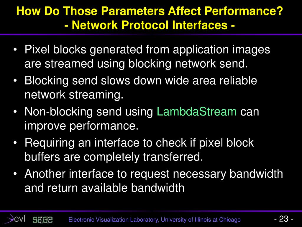 How Do Those Parameters Affect Performance? - Network Protocol Interfaces - • Pixel blocks generated from application images are streamed using blocking network send. • Blocking send slows down wide area reliable network streaming. • Non-blocking send using LambdaStream can improve performance. • Requiring an interface to check if pixel block buffers are completely transferred. • Another interface to request necessary bandwidth and return available bandwidth - 23 -