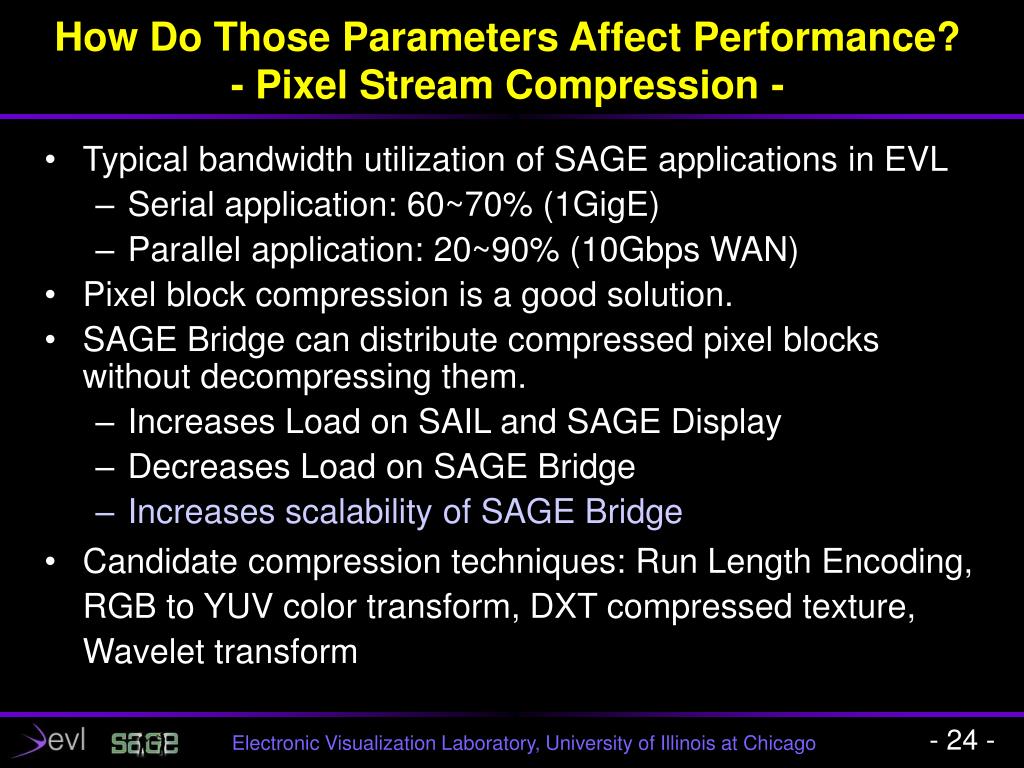 How Do Those Parameters Affect Performance? - Pixel Stream Compression - • Typical bandwidth utilization of SAGE applications in EVL • Serial application: 60~70% (1GigE) • Parallel application: 20~90% (10Gbps WAN) • Pixel block compression is a good solution. • SAGE Bridge can distribute compressed pixel blocks without decompressing them. • Increases Load on SAIL and SAGE Display • Decreases Load on SAGE Bridge • Increases scalability of SAGE Bridge • Candidate compression techniques: Run Length Encoding, RGB to YUV color transform, DXT compressed texture, Wavelet transform - 24 -