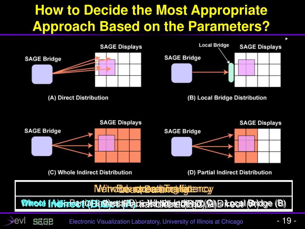 How to Arbitrarily Scale Simultaneous Data Distribution to Multiple Receivers? • Incremental bridge node allocation: If initially allocated nodes become overloaded, SAGE Bridge allocates additional nodes for the visualcasting session. • SAIL needs to re-partition images considering newly added nodes and load-balancing. • New network connections, reconfiguration of existing streams • What are the conditions for adding or removing SAGE Bridge nodes? • How to minimize jitter on existing streams? • No additional node available: request SAIL to down-sample or compress pixel blocks - 18 -
