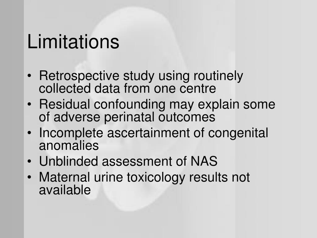 Limitations • Retrospective study using routinely collected data from one centre • Residual confounding may explain some of adverse perinatal outcomes • Incomplete ascertainment of congenital anomalies • Unblinded assessment of NAS • Maternal urine toxicology results not available
