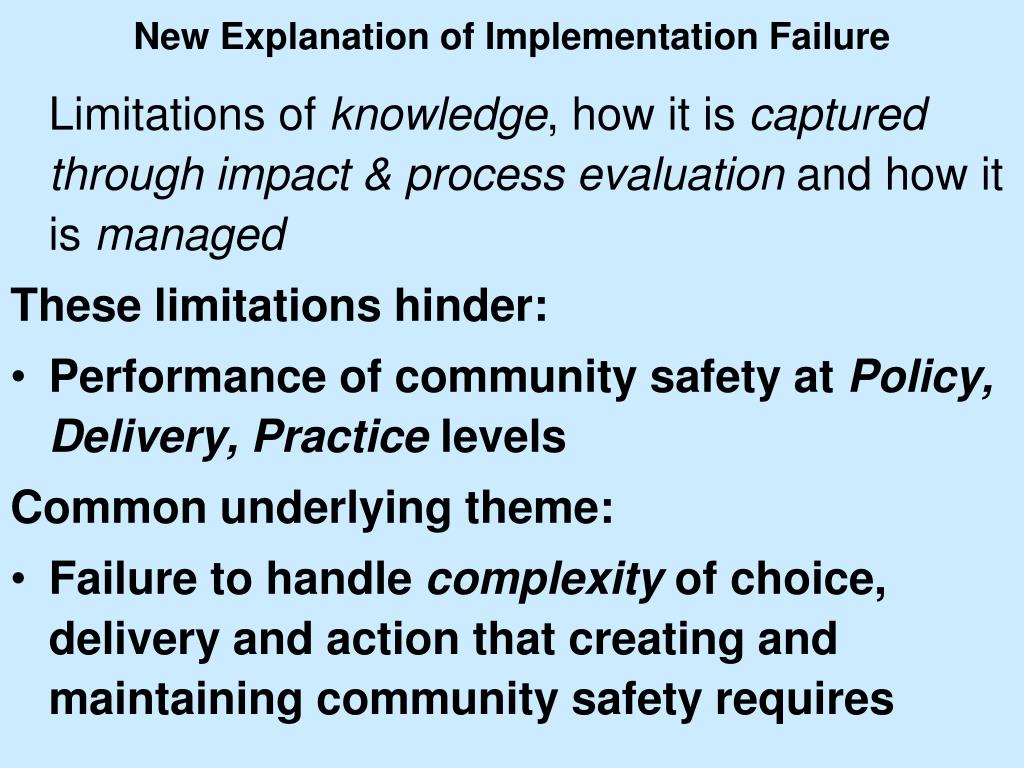 New Explanation of Implementation Failure Limitations of knowledge, how it is captured through impact & process evaluation and how it is managed These limitations hinder: • Performance of community safety at Policy, Delivery, Practicelevels Common underlying theme: • Failure to handle complexity of choice, delivery and action that creating and maintaining community safety requires