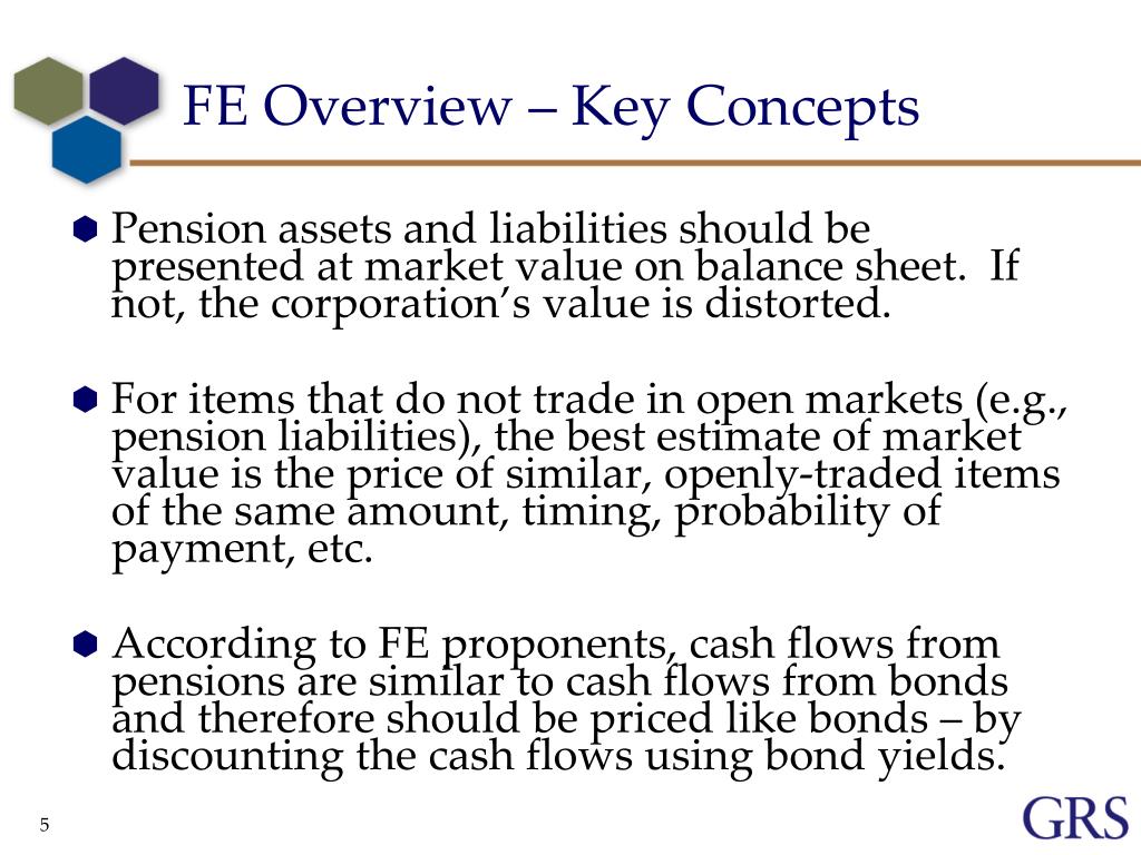 FE Overview – Key Concepts • Pension assets and liabilities should be presented at market value on balance sheet. If not, the corporation’s value is distorted. • For items that do not trade in open markets (e.g., pension liabilities), the best estimate of market value is the price of similar, openly-traded items of the same amount, timing, probability of payment, etc. • According to FE proponents, cash flows from pensions are similar to cash flows from bonds and therefore should be priced like bonds – by discounting the cash flows using bond yields.