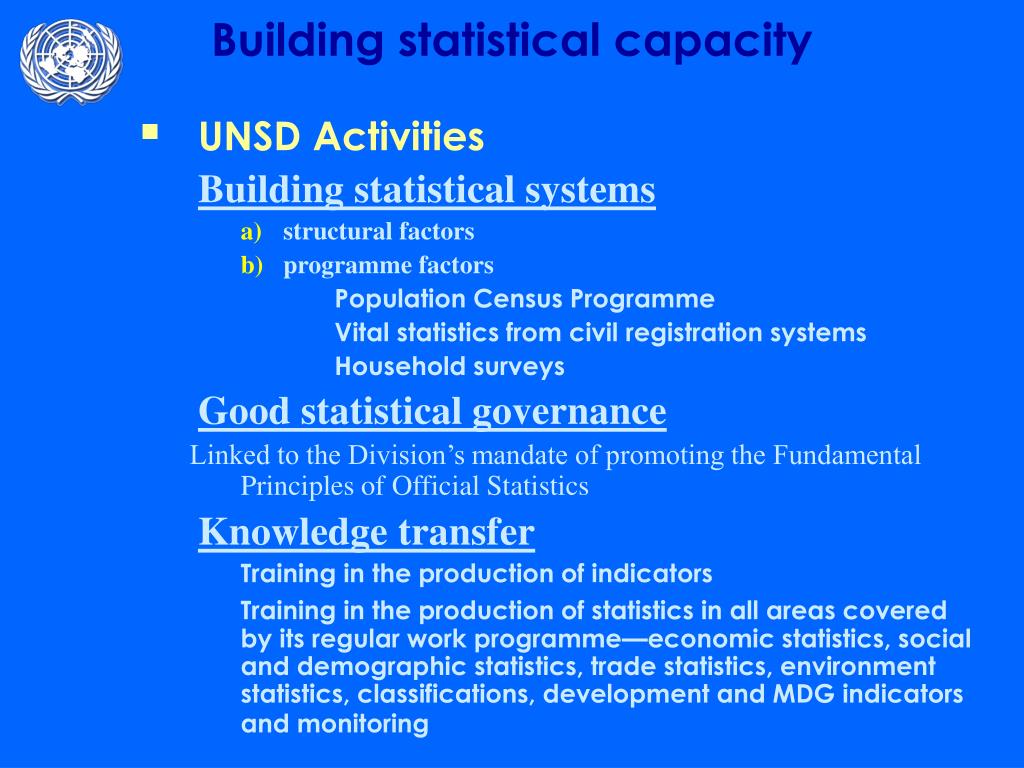 UNSD Activities Building statistical systems structural factors programme factors Population Census Programme Vital statistics from civil registration systems Household surveys Good statistical governance Linked to the Division’s mandate of promoting the Fundamental Principles of Official Statistics Knowledge transfer Training in the production of indicators Training in the production of statistics in all areas covered by its regular work programme—economic statistics, social and demographic statistics, trade statistics, environment statistics, classifications, development and MDG indicators and monitoring Building statistical capacity