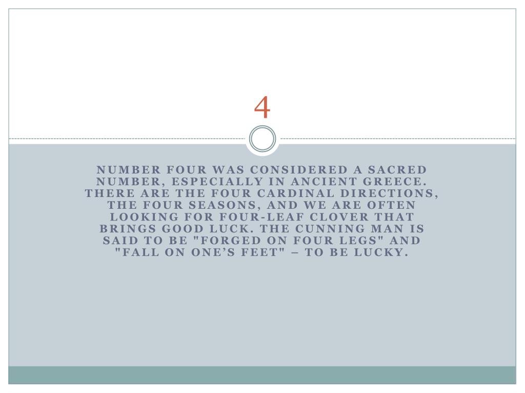 4 Number four was considered a sacred number, especially in ancient Greece. There are the four cardinal directions, the four seasons, and we are often looking for four-leaf clover that brings good luck. The cunning man issaid to be "forged on four legs" and "fall on one’s feet" – to be lucky.