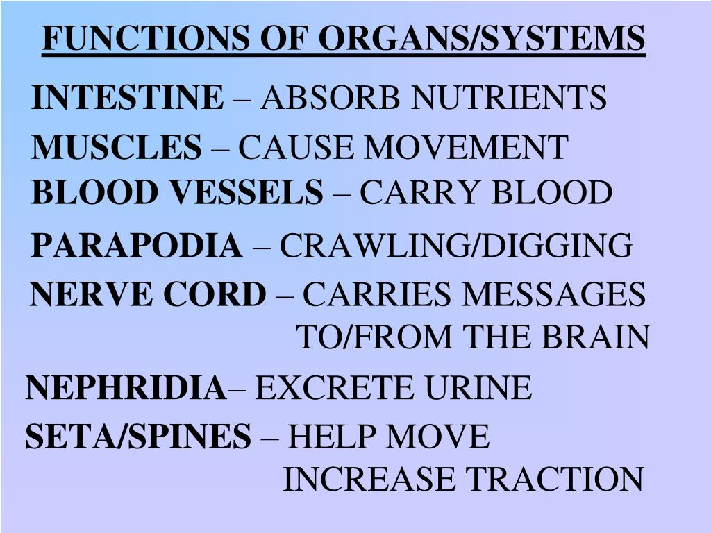 FUNCTIONS OF ORGANS/SYSTEMS INTESTINE – ABSORB NUTRIENTS MUSCLES – CAUSE MOVEMENT BLOOD VESSELS – CARRY BLOOD PARAPODIA – CRAWLING/DIGGING NERVE CORD – CARRIES MESSAGES TO/FROM THE BRAIN NEPHRIDIA– EXCRETE URINE SETA/SPINES – HELP MOVE INCREASE TRACTION