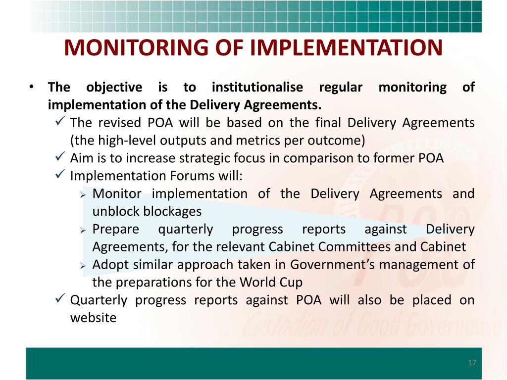 MONITORING OF IMPLEMENTATION • The objective is to institutionalise regular monitoring of implementation of the Delivery Agreements. • The revised POA will be based on the final Delivery Agreements (the high‐level outputs and metrics per outcome) • Aim is to increase strategic focus in comparison to former POA • Implementation Forums will: • Monitor implementation of the Delivery Agreements and unblock blockages • Prepare quarterly progress reports against Delivery Agreements, for the relevant Cabinet Committees and Cabinet • Adopt similar approach taken in Government’s management of the preparations for the World Cup • Quarterly progress reports against POA will also be placed on website