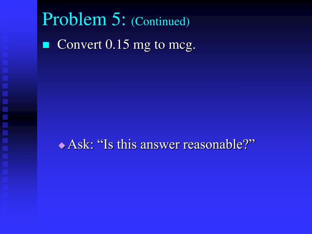 0 Problem 5: (Continued) • Convert 0.15 mg to mcg. • Ask: “Is this answer reasonable?”
