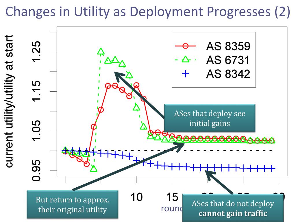 Changes in Utility as Deployment Progresses (2) ASes that deploy see initial gains But return to approx. their original utility ASes that do not deploy cannot gain traffic round