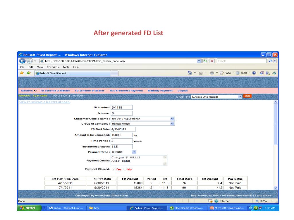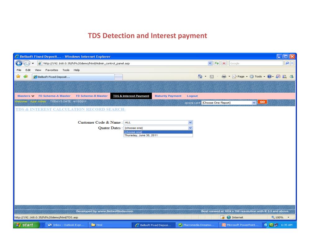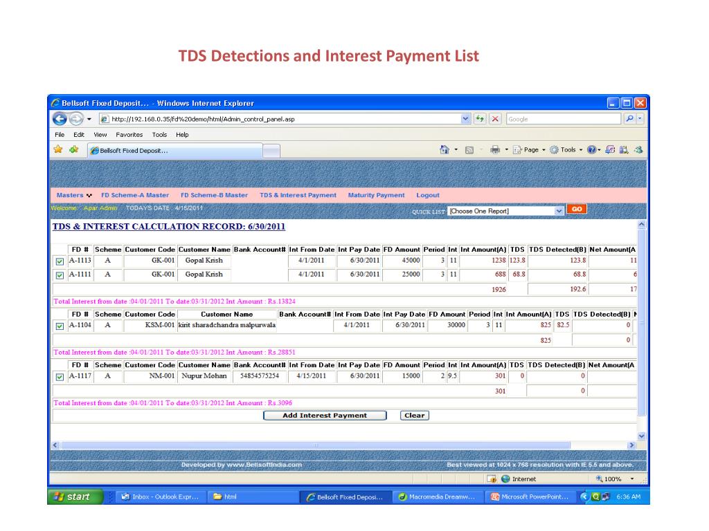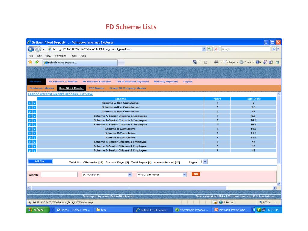Login Screen. MASTER RECORDS. Fixed Deposit Customer Master List. Add New Fixed Deposit Customer. FD Scheme Lists. Add FD Schemes, # of Years and INT Amount (One time Entry). TDS Master: If Total Interest Amount Goes More than Rs.5000/- Then 10% tax (One time Entry). Group Of Company List.