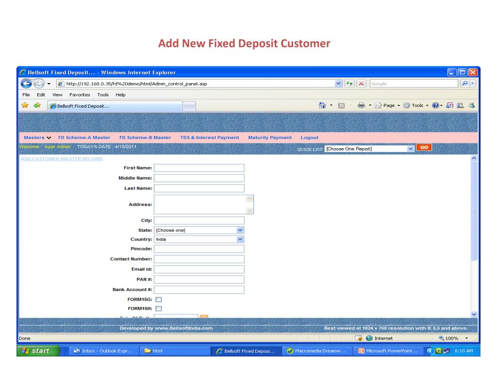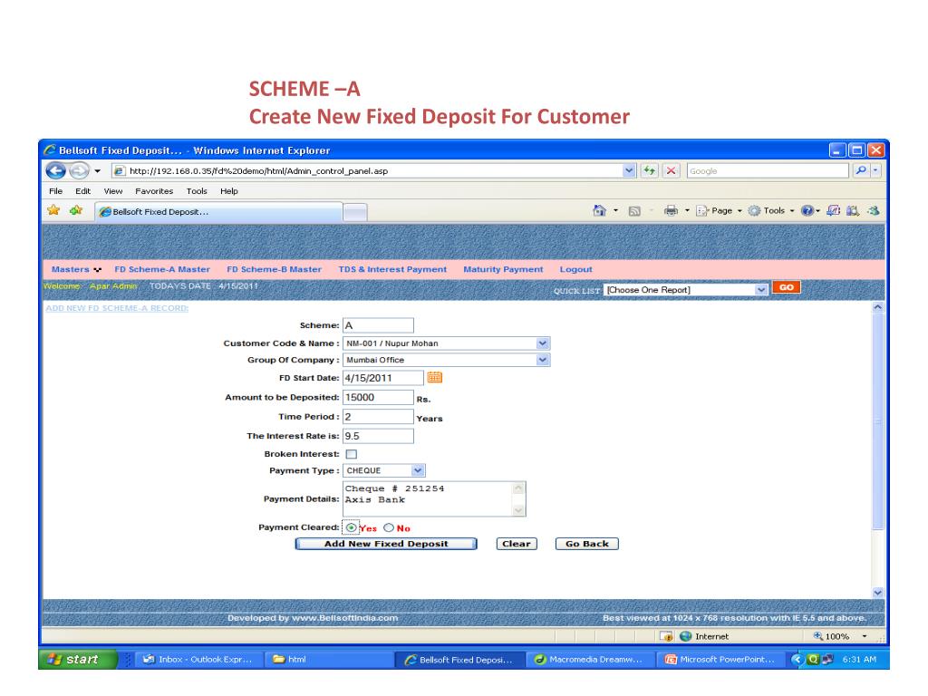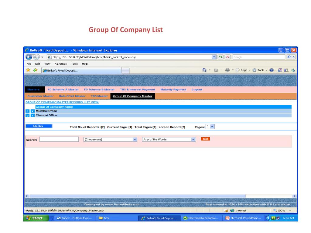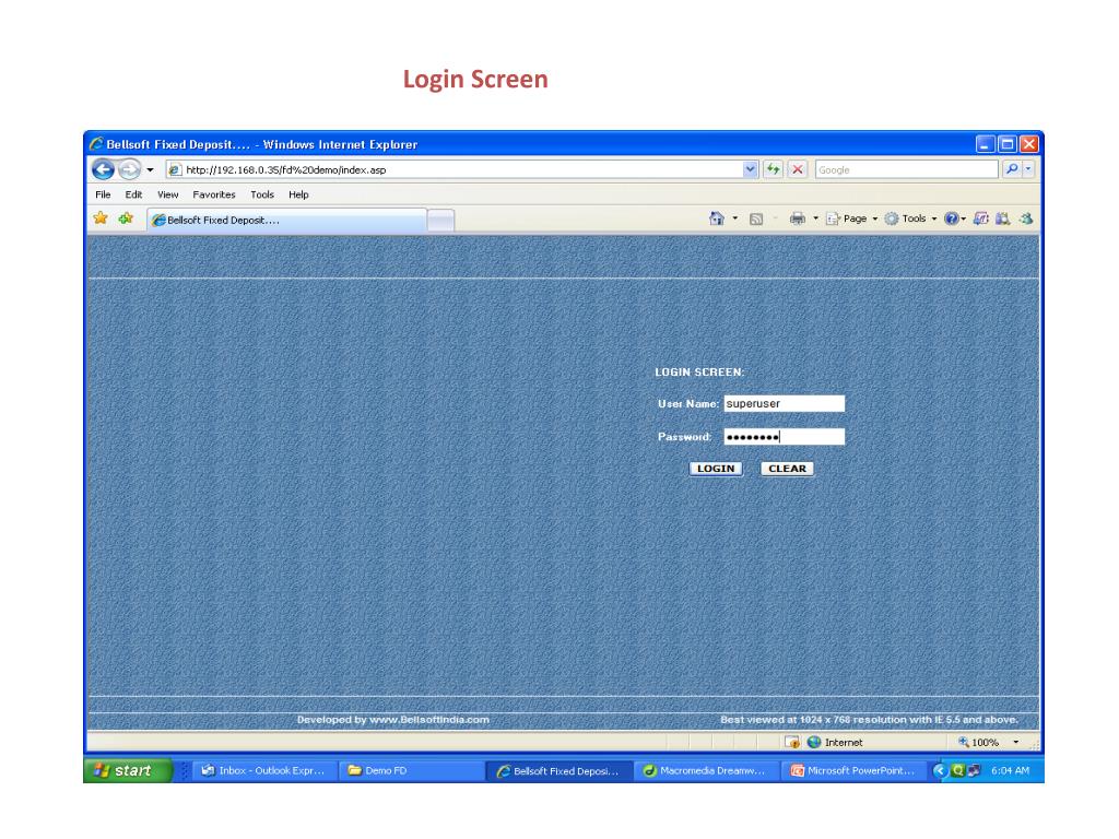 Login Screen. MASTER RECORDS. Fixed Deposit Customer Master List. Add New Fixed Deposit Customer. FD Scheme Lists. Add FD Schemes, # of Years and INT Amount (One time Entry). TDS Master: If Total Interest Amount Goes More than Rs.5000/- Then 10% tax (One time Entry). Group Of Company List.