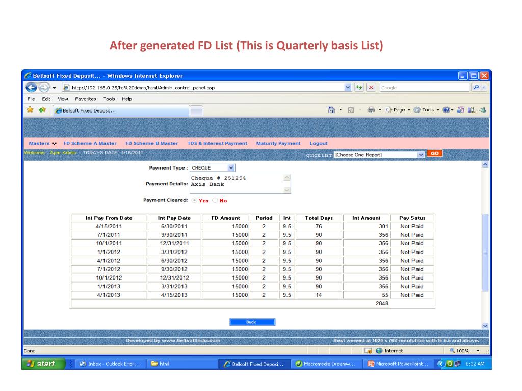 After generated FD List (This is Quarterly basis List) Cumulative Interest options will not show Quarterly Interest payment option. Maturity Amount will show only end of the Maturity Date.