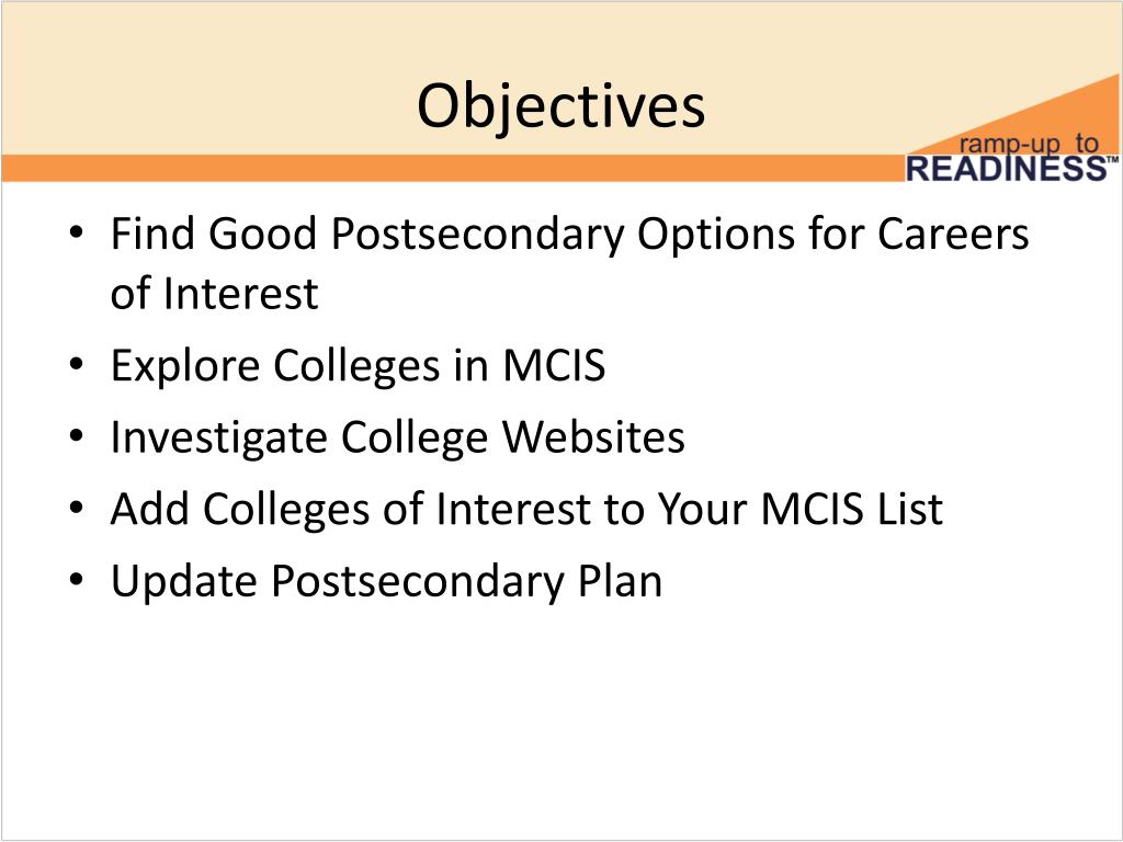 Objectives • Find Good Postsecondary Options for Careers of Interest • Explore Colleges in MCIS • Investigate College Websites • Add Colleges of Interest to Your MCIS List • Update Postsecondary Plan