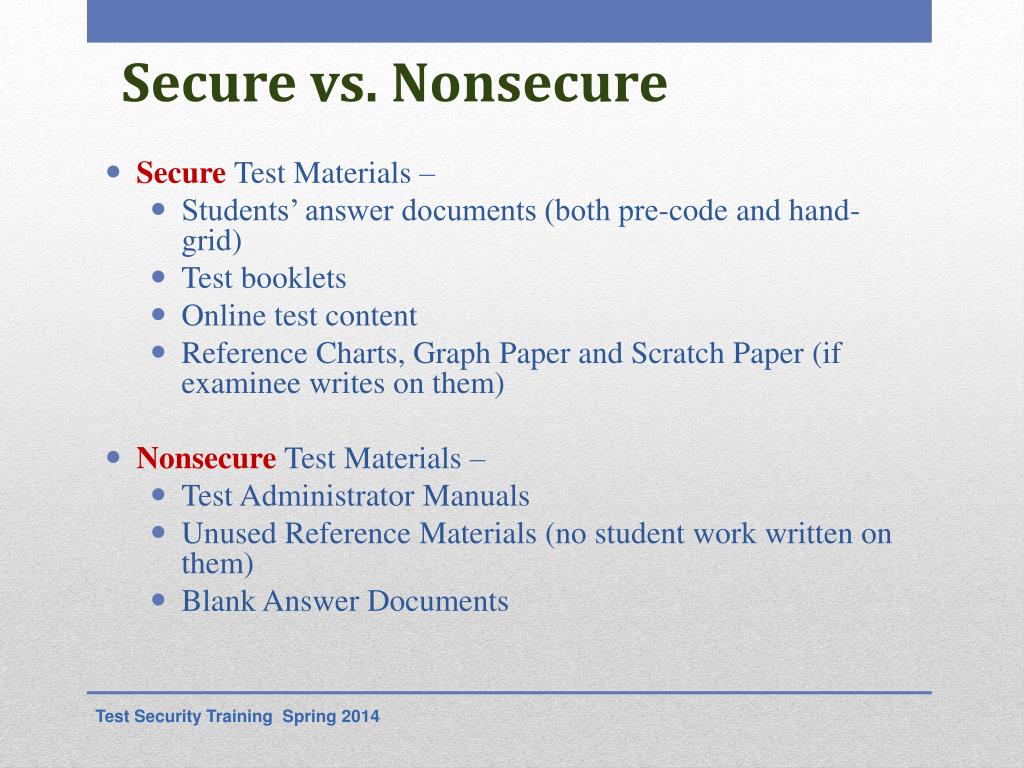 Secure Test Materials – • Students’ answer documents (both pre-code and hand-grid) • Test booklets • Online test content • Reference Charts, Graph Paper and Scratch Paper (if examinee writes on them) • Nonsecure Test Materials – • Test Administrator Manuals • Unused Reference Materials (no student work written on them) • Blank Answer Documents Secure vs. Nonsecure Test Security Training Spring 2014