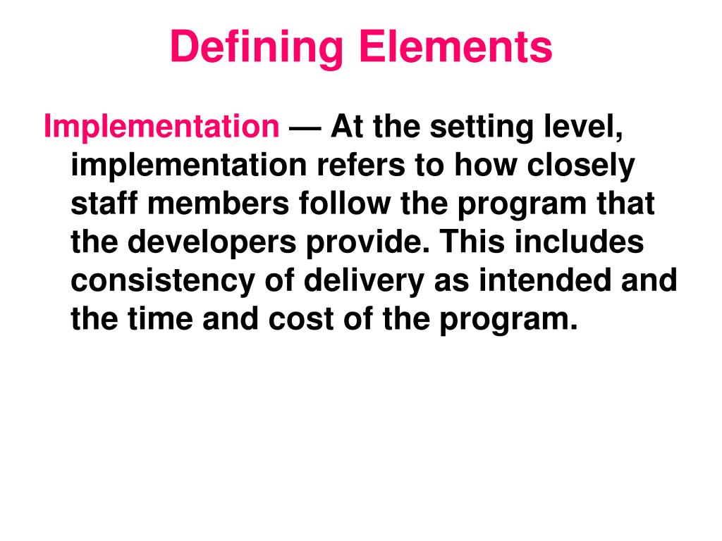 Defining Elements Implementation — At the setting level, implementation refers to how closely staff members follow the program that the developers provide. This includes consistency of delivery as intended and the time and cost of the program.