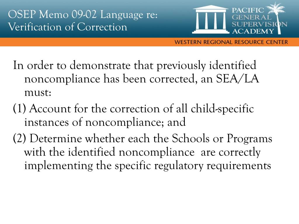 OSEP Memo 09-02 Language re: Verification of Correction In order to demonstrate that previously identified noncompliance has been corrected, an SEA/LA must: (1) Account for the correction of all child-specific instances of noncompliance; and (2) Determine whether each the Schools or Programs with the identified noncompliance are correctly implementing the specific regulatory requirements