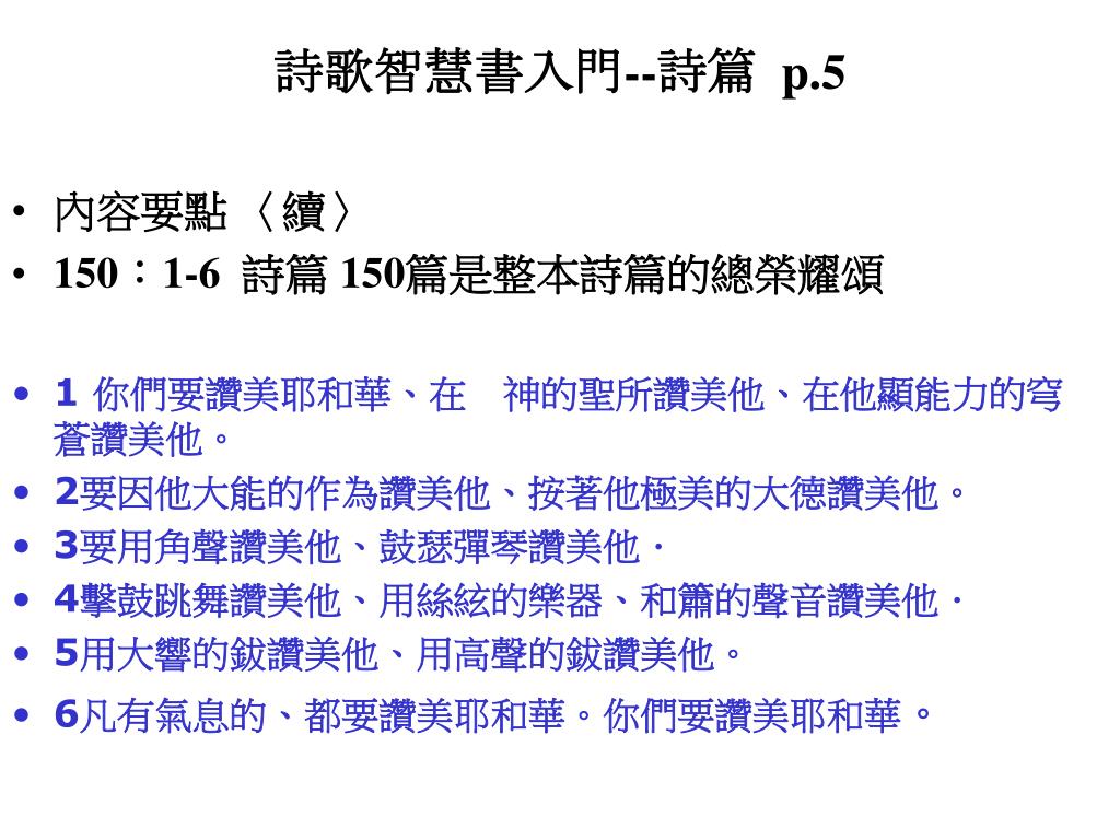 詩歌智慧書入門--詩篇 p.5 • 內容要點 〈續〉 • 150:1-6 詩篇 150篇是整本詩篇的總榮耀頌 • 1 你們要讚美耶和華、在 神的聖所讚美他、在他顯能力的穹蒼讚美他。 • 2要因他大能的作為讚美他、按著他極美的大德讚美他。 • 3要用角聲讚美他、鼓瑟彈琴讚美他. • 4擊鼓跳舞讚美他、用絲絃的樂器、和簫的聲音讚美他. • 5用大響的鈸讚美他、用高聲的鈸讚美他。 • 6凡有氣息的、都要讚美耶和華。你們要讚美耶和華。