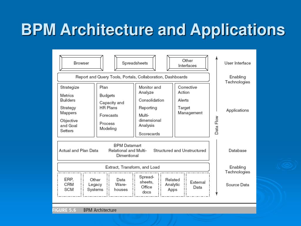 BPM Architecture and Applications • BPM architecture • Database tier designs include: • Transactional data stores • Application data marts • Centralized data warehouse