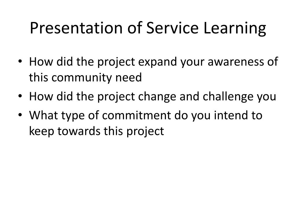 Presentation of Service Learning • How did the project expand your awareness of this community need • How did the project change and challenge you • What type of commitment do you intend to keep towards this project