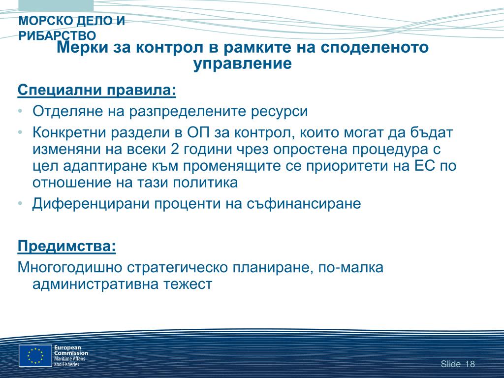 Мерки за контрол в рамките на споделеното управление Специални правила: • Отделяне на разпределените ресурси • Конкретни раздели в ОП за контрол, които могат да бъдат изменяни на всеки 2 години чрез опростена процедура с цел адаптиране към променящите се приоритети на ЕС по отношение на тази политика • Диференцирани проценти на съфинансиране Предимства: Многогодишно стратегическо планиране, по-малка административна тежест