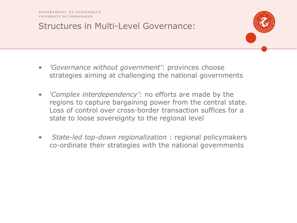 Structures in Multi-Level Governance: • 'Governance without government’: provinces choose strategies aiming at challenging the national governments • ‘Complex interdependency’: no efforts are made by the regions to capture bargaining power from the central state. Loss of control over cross-border transaction suffices for a state to loose sovereignty to the regional level • State-led top-down regionalization : regional policymakers co-ordinate their strategies with the national governments