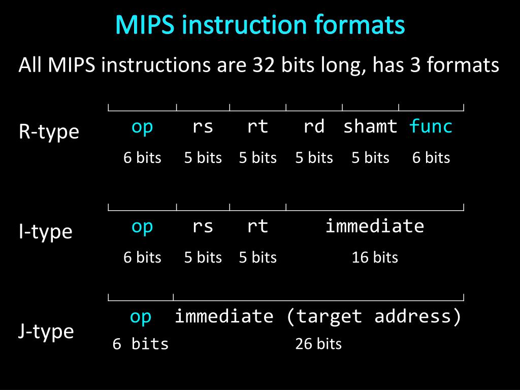 MIPS instruction formats • All MIPS instructions are 32 bits long, has 3 formats • R-type • I-type • J-type
