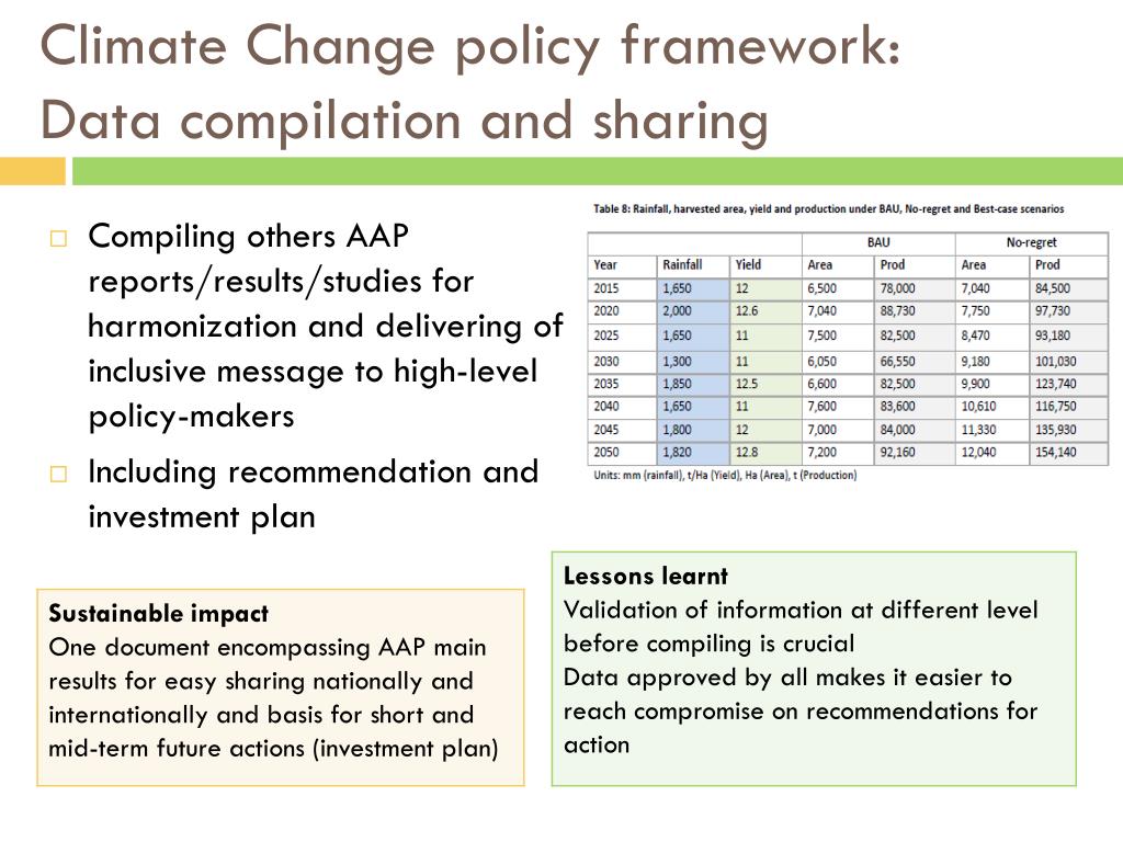 Climate Change policy framework:Data compilation and sharing • Compiling others AAP reports/results/studies for harmonization and delivering of inclusive message to high-level policy-makers • Including recommendation and investment plan