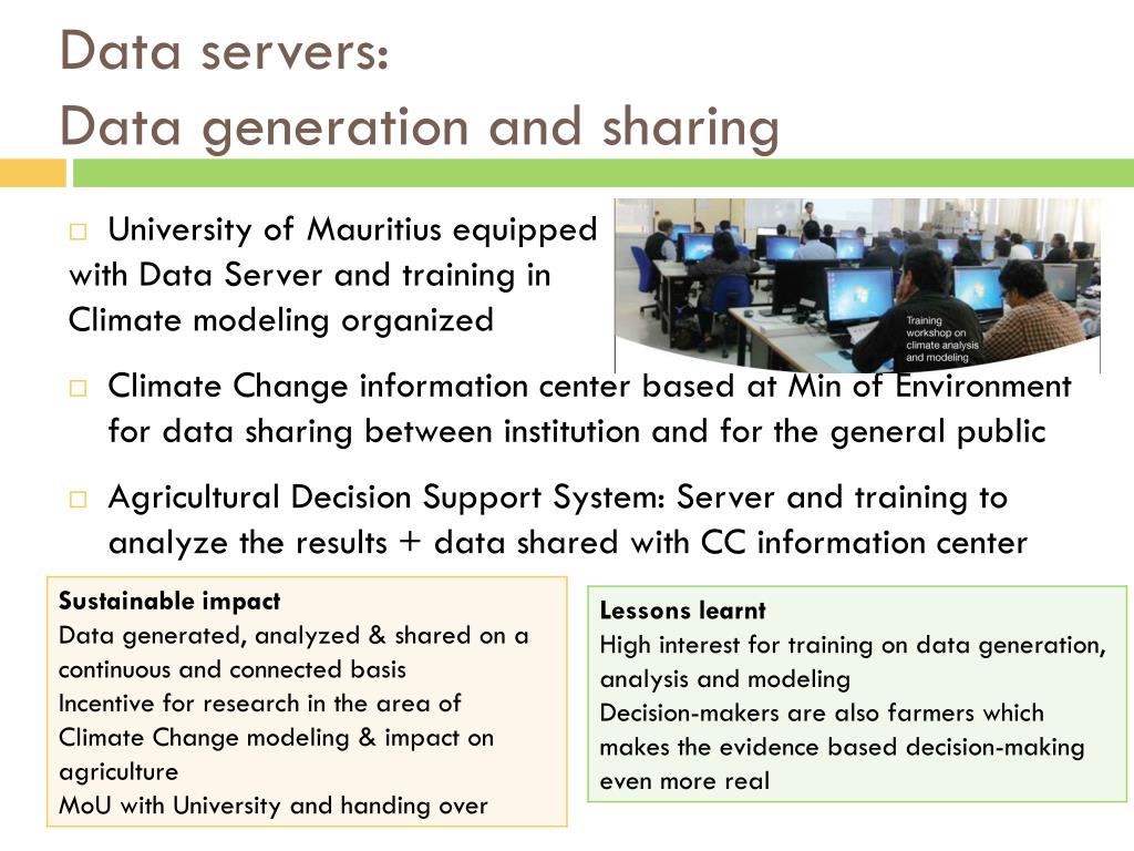 Data servers:Data generation and sharing • University of Mauritius equipped with Data Server and training in Climate modeling organized • Climate Change information center based at Min of Environment for data sharing between institution and for the general public • Agricultural Decision Support System: Server and training to analyze the results + data shared with CC information center