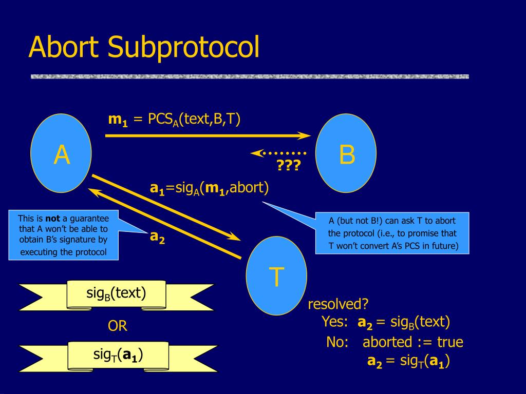 m1 = PCSA(text,B,T) ??? a2 T resolved? Yes: a2 = sigB(text) No: aborted := true a2 = sigT(a1) sigB(text) OR sigT(a1) Abort Subprotocol A B a1=sigA(m1,abort) This is not a guarantee that A won’t be able to obtain B’s signature by executing the protocol A (but not B!) can ask T to abort the protocol (i.e., to promise that T won’t convert A’s PCS in future)