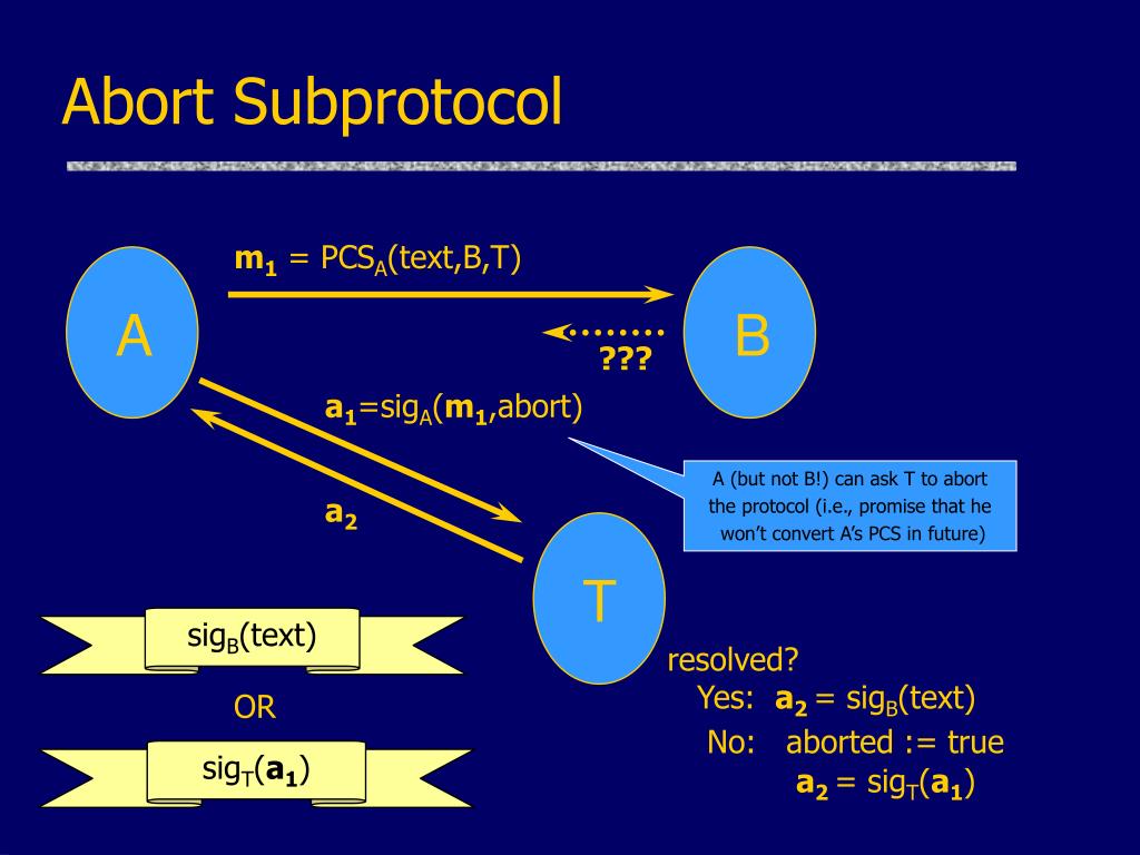 m1 = PCSA(text,B,T) ??? a2 T resolved? Yes: a2 = sigB(text) No: aborted := true a2 = sigT(a1) sigB(text) OR sigT(a1) Abort Subprotocol A B a1=sigA(m1,abort) A (but not B!) can ask T to abort the protocol (i.e., promise that he won’t convert A’s PCS in future)