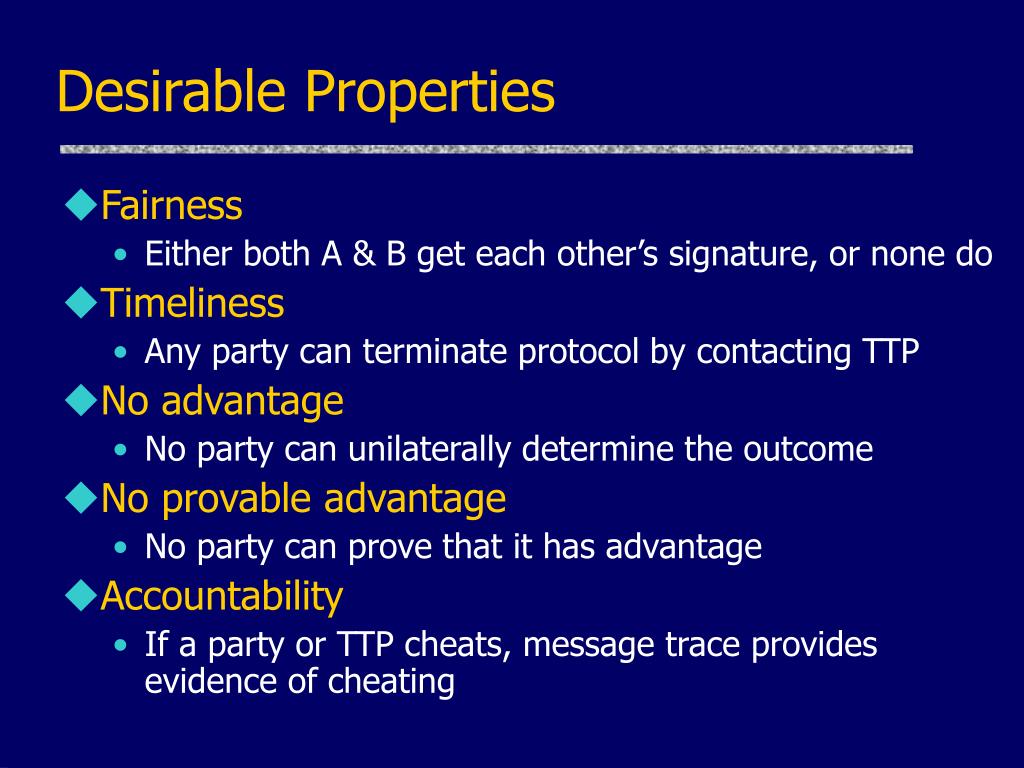 Desirable Properties • Fairness • Either both A & B get each other’s signature, or none do • Timeliness • Any party can terminate protocol by contacting TTP • No advantage • No party can unilaterally determine the outcome • No provable advantage • No party can prove that it has advantage • Accountability • If a party or TTP cheats, message trace provides evidence of cheating