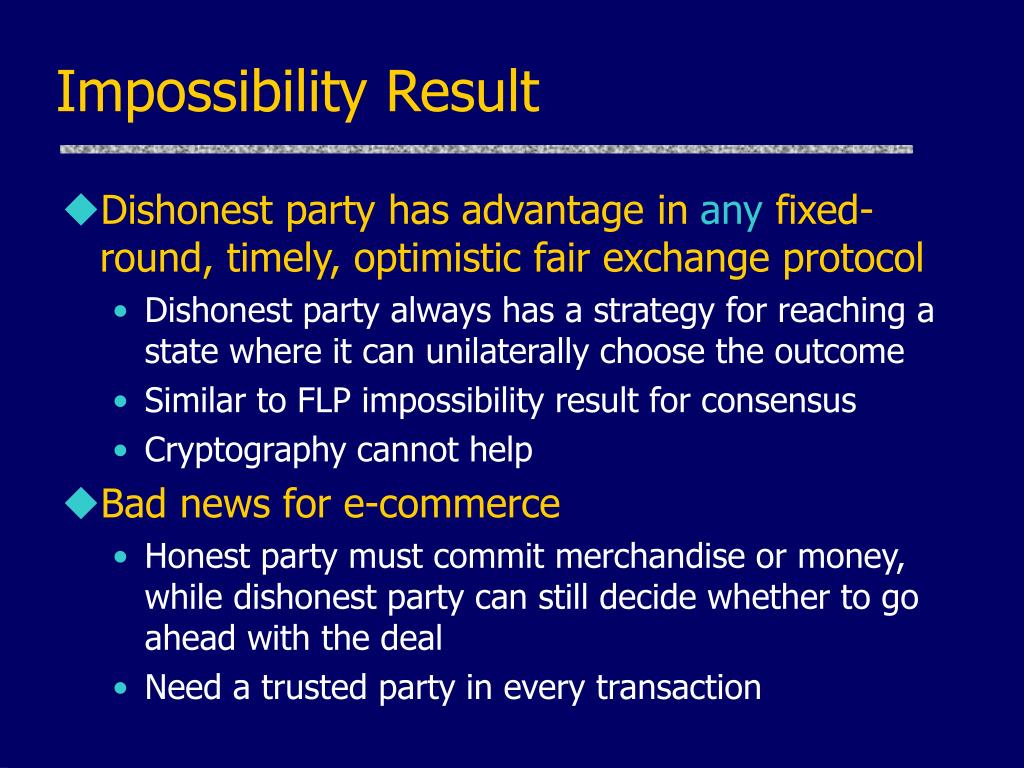 Impossibility Result • Dishonest party has advantage in any fixed-round, timely, optimistic fair exchange protocol • Dishonest party always has a strategy for reaching a state where it can unilaterally choose the outcome • Similar to FLP impossibility result for consensus • Cryptography cannot help • Bad news for e-commerce • Honest party must commit merchandise or money, while dishonest party can still decide whether to go ahead with the deal • Need a trusted party in every transaction