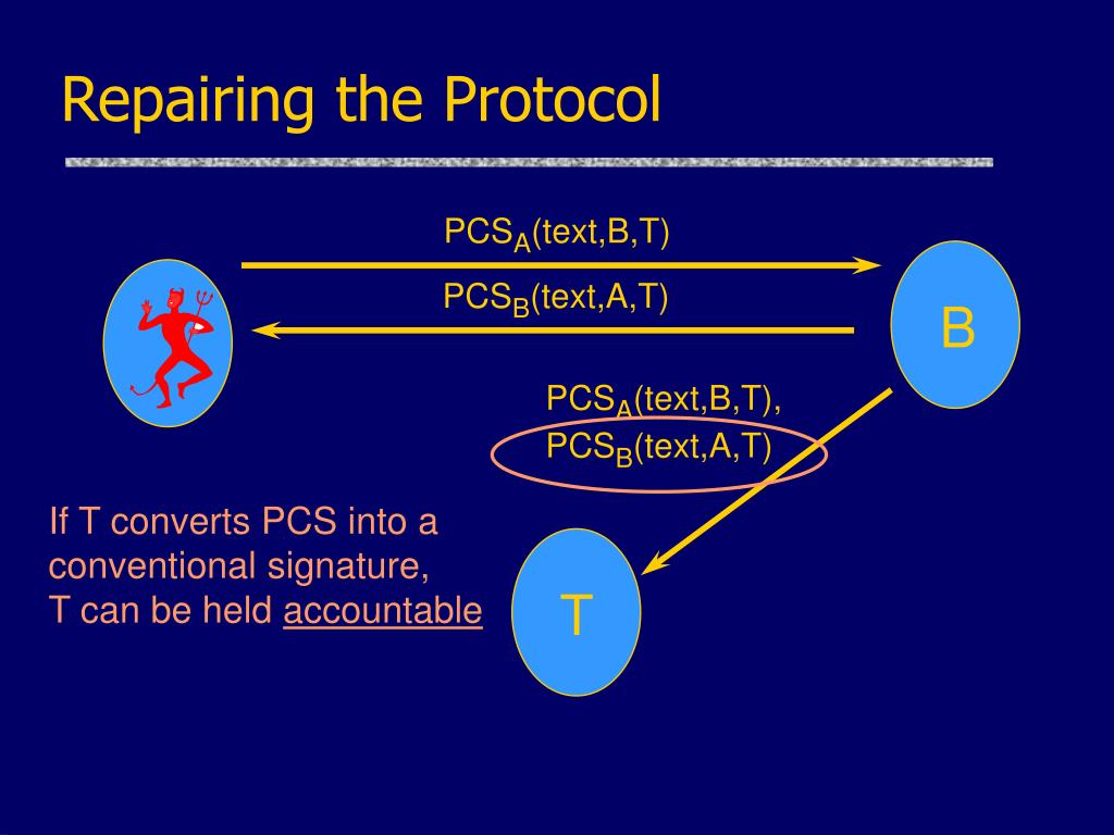 PCSA(text,B,T) PCSB(text,A,T) T Repairing the Protocol B PCSA(text,B,T), PCSB(text,A,T) If T converts PCS into a conventional signature, T can be heldaccountable