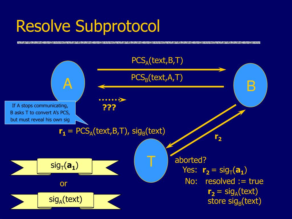PCSA(text,B,T) PCSB(text,A,T) ??? r1 = PCSA(text,B,T), sigB(text) r2 T aborted? Yes: r2 = sigT(a1) No: resolved := true r2 = sigA(text) store sigB(text) sigT(a1) or sigA(text) Resolve Subprotocol A B If A stops communicating, B asks T to convert A’s PCS, but must reveal his own sig