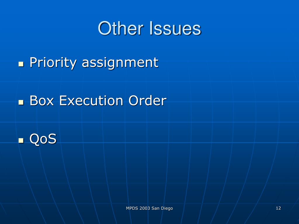 Other Issues • Priority assignment • Box Execution Order • QoS MPDS 2003 San Diego