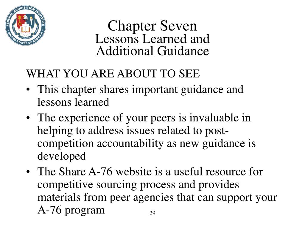 Chapter SevenLessons Learned and Additional Guidance WHAT YOU ARE ABOUT TO SEE • This chapter shares important guidance and lessons learned • The experience of your peers is invaluable in helping to address issues related to post-competition accountability as new guidance is developed • The Share A-76 website is a useful resource for competitive sourcing process and provides materials from peer agencies that can support your A-76 program 29