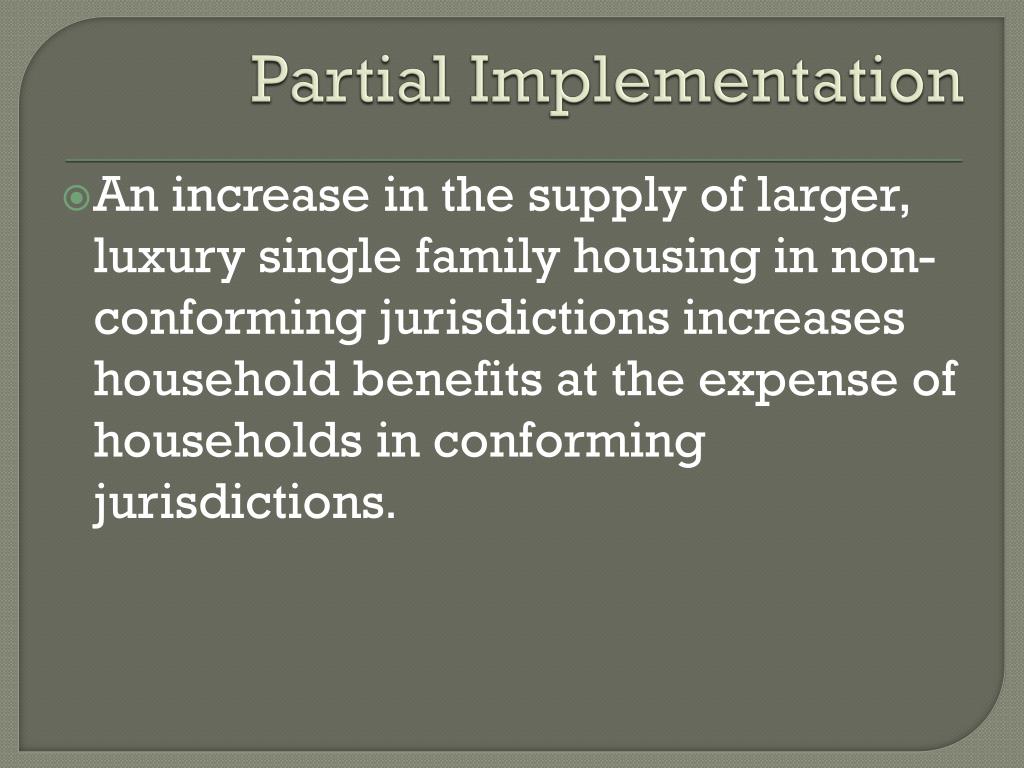 Partial Implementation • An increase in the supply of larger, luxury single family housing in non-conforming jurisdictions increases household benefits at the expense of households in conforming jurisdictions.