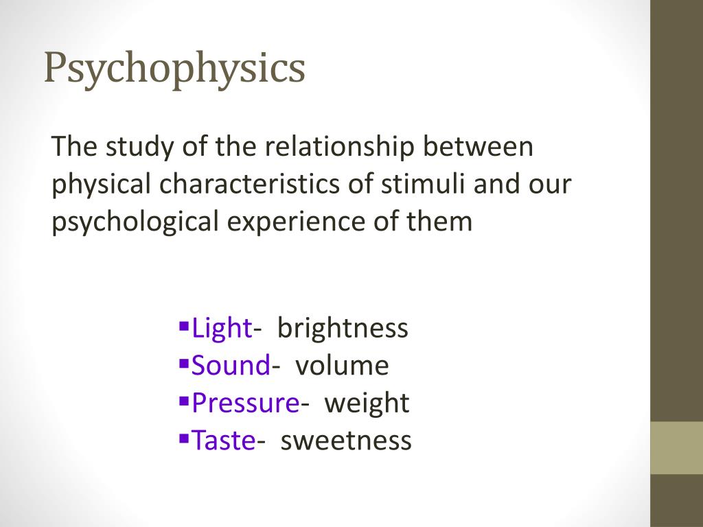 Psychophysics The study of the relationship between physical characteristics of stimuli and our psychological experience of them • Light- brightness • Sound- volume • Pressure- weight • Taste- sweetness