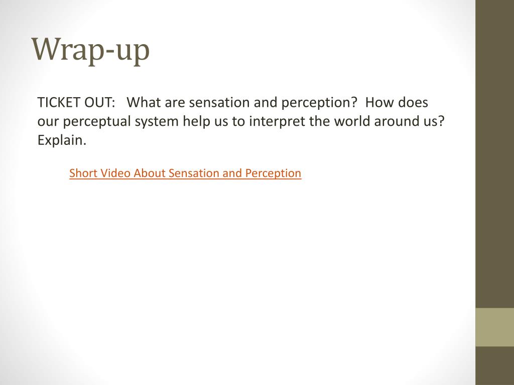 Wrap-up TICKET OUT: What are sensation and perception? How does our perceptual system help us to interpret the world around us? Explain. Short Video About Sensation and Perception