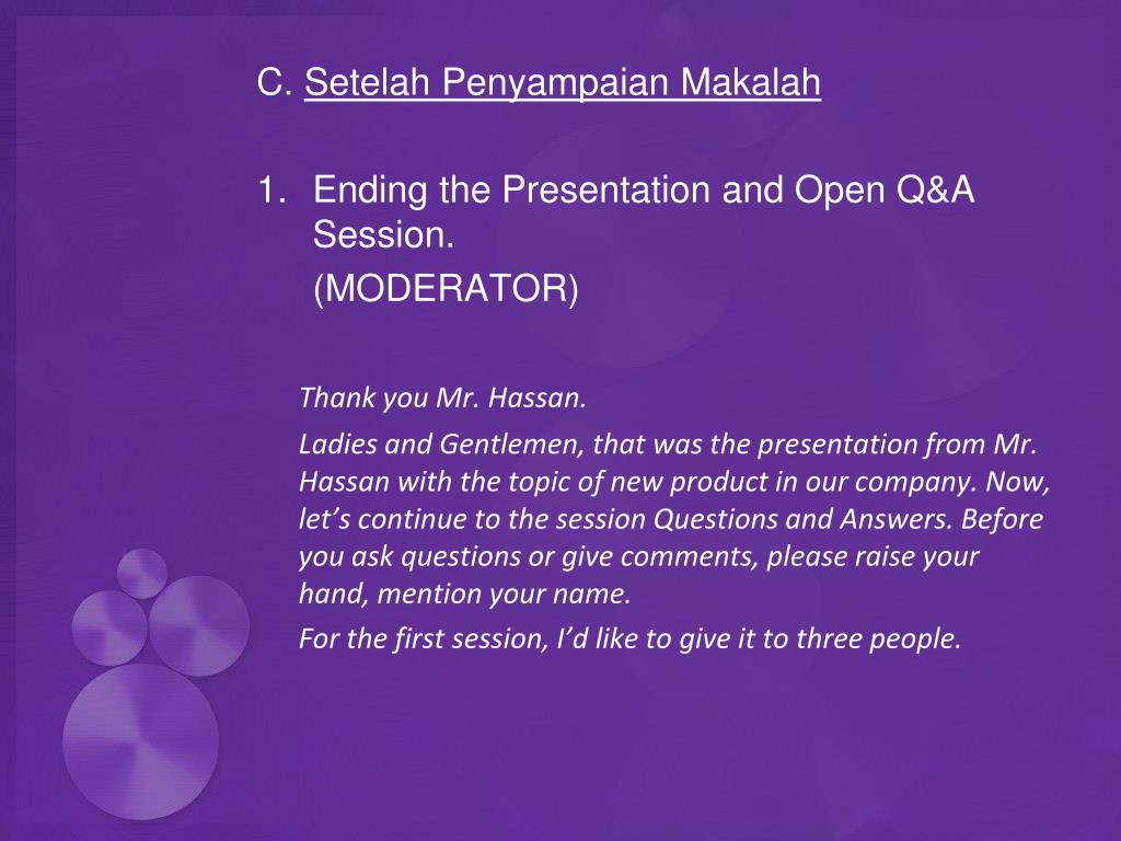 C. Setelah Penyampaian Makalah • Ending the Presentation and Open Q&A Session. (MODERATOR) Thank you Mr. Hassan. Ladies and Gentlemen, that was the presentation from Mr. Hassan with the topic of new product in our company. Now, let’s continue to the session Questions and Answers. Before you ask questions or give comments, please raise your hand, mention your name. For the first session, I’d like to give it to three people.