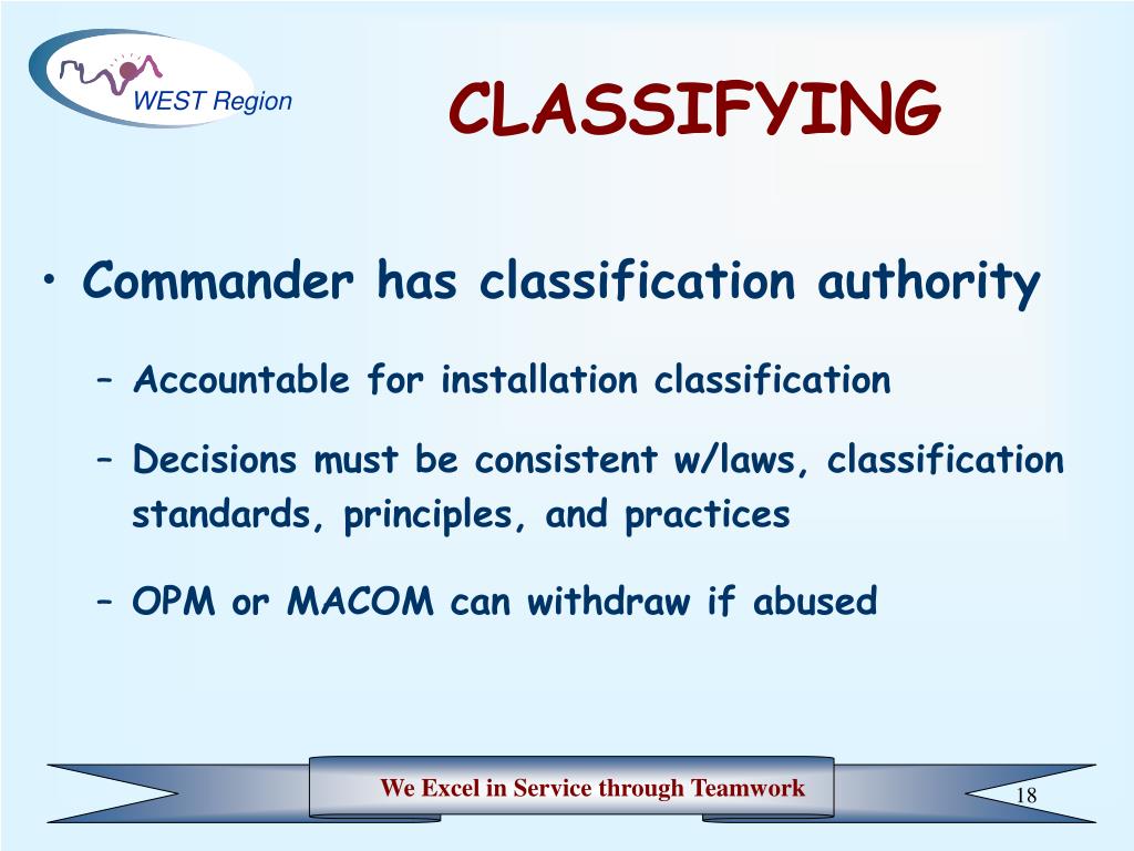 CLASSIFYING • Commander has classification authority • Accountable for installation classification • Decisions must be consistent w/laws, classification standards, principles, and practices • OPM or MACOM can withdraw if abused