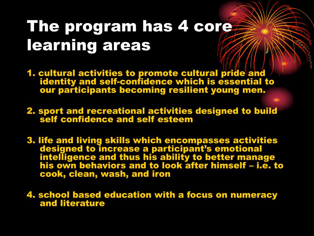 The program has 4 core learning areas 1. cultural activities to promote cultural pride and identity and self-confidence which is essential to our participants becoming resilient young men. 2. sport and recreational activities designed to build self confidence and self esteem 3. life and living skills which encompasses activities designed to increase a participant’s emotional intelligence and thus his ability to better manage his own behaviors and to look after himself – i.e. to cook, clean, wash, and iron 4. school based education with a focus on numeracy and literature