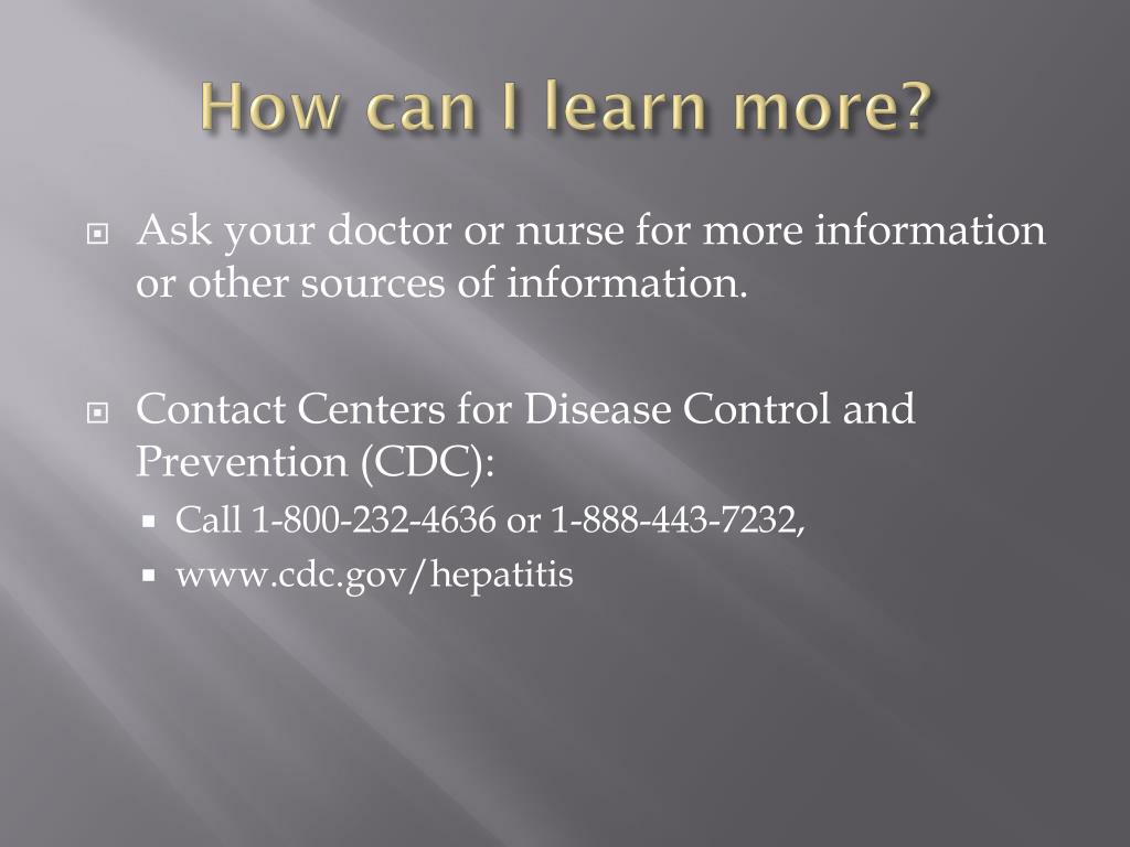 How can I learn more? • Ask your doctor or nurse for more information or other sources of information. • Contact Centers for Disease Control and Prevention (CDC): • Call 1-800-232-4636 or 1-888-443-7232, • www.cdc.gov/hepatitis