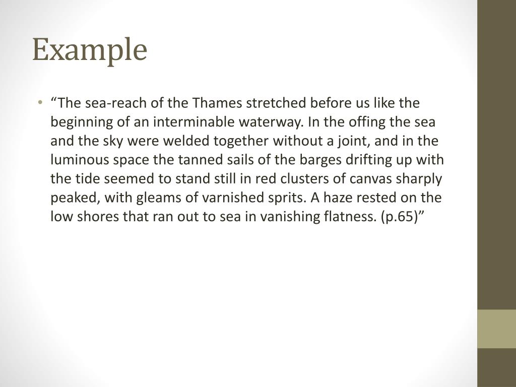 Example • “The sea-reach of the Thames stretched before us like the beginning of an interminable waterway. In the offing the sea and the sky were welded together without a joint, and in the luminous space the tanned sails of the barges drifting up with the tide seemed to stand still in red clusters of canvas sharply peaked, with gleams of varnished sprits. A haze rested on the low shores that ran out to sea in vanishing flatness. (p.65)”