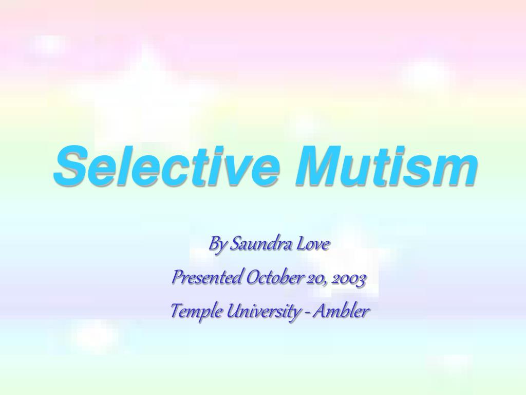Selective Mutism. By Saundra Love Presented October 20, 2003 Temple University - Ambler. What is Selective Mutism?. A psychiatric disorder most commonly found in children. Characterized by a persistent failure to speak in select settings which continues for more than 1 month.