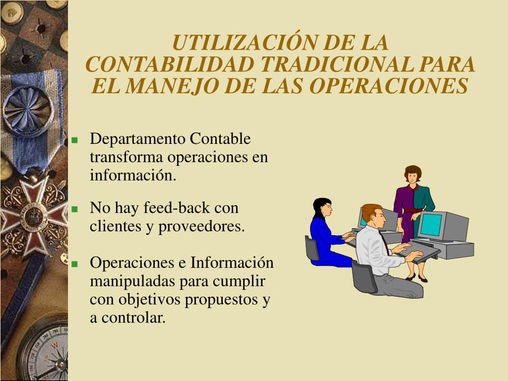 UTILIZACIÓN DE LA CONTABILIDAD TRADICIONAL PARA EL MANEJO DE LAS OPERACIONES • Departamento Contable transforma operaciones en información. • No hay feed-back con clientes y proveedores. • Operaciones e Información manipuladas para cumplir con objetivos propuestos y a controlar.