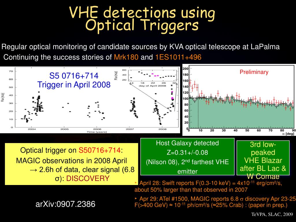 VHE detections using Optical Triggers Regular optical monitoring of candidate sources by KVA optical telescope at LaPalma Continuing the success stories of Mrk180 and 1ES1011+496 Preliminary S5 0716+714 Trigger in April 2008 Host Galaxy detected Z=0.31+/-0.08 (Nilson 08), 2nd farthest VHE emitter 3rd low-peaked VHE Blazar after BL Lac & W Comae Optical trigger on S50716+714: MAGIC observations in 2008 April→ 2.6h of data, clear signal (6.8 σ): DISCOVERY • April 28: Swift reports F(0.3-10 keV) = 4x10-11 erg/cm²/s, • about 50% larger than that observed in 2007 • Apr 29: ATel #1500, MAGIC reports 6.8 s discovery Apr 23-25 • F(>400 GeV) ≈10-11 ph/cm²/s (≈25% Crab) : (paper in prep.) arXiv:0907.2386 TeVPA, SLAC, 2009