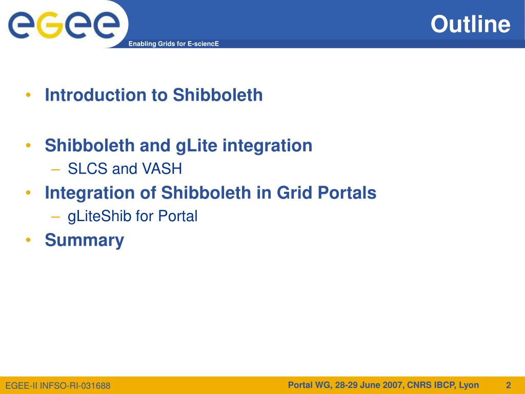 Outline • Introduction to Shibboleth • Shibboleth and gLite integration • SLCS and VASH • Integration of Shibboleth in Grid Portals • gLiteShib for Portal • Summary Portal WG, 28-29 June 2007, CNRS IBCP, Lyon