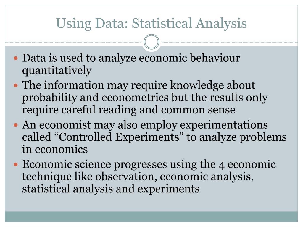 Using Data: Statistical Analysis Data is used to analyze economic behaviour quantitatively The information may require knowledge about probability and econometrics but the results only require careful reading and common sense An economist may also employ experimentations called “Controlled Experiments” to analyze problems in economics Economic science progresses using the 4 economic technique like observation, economic analysis, statistical analysis and experiments